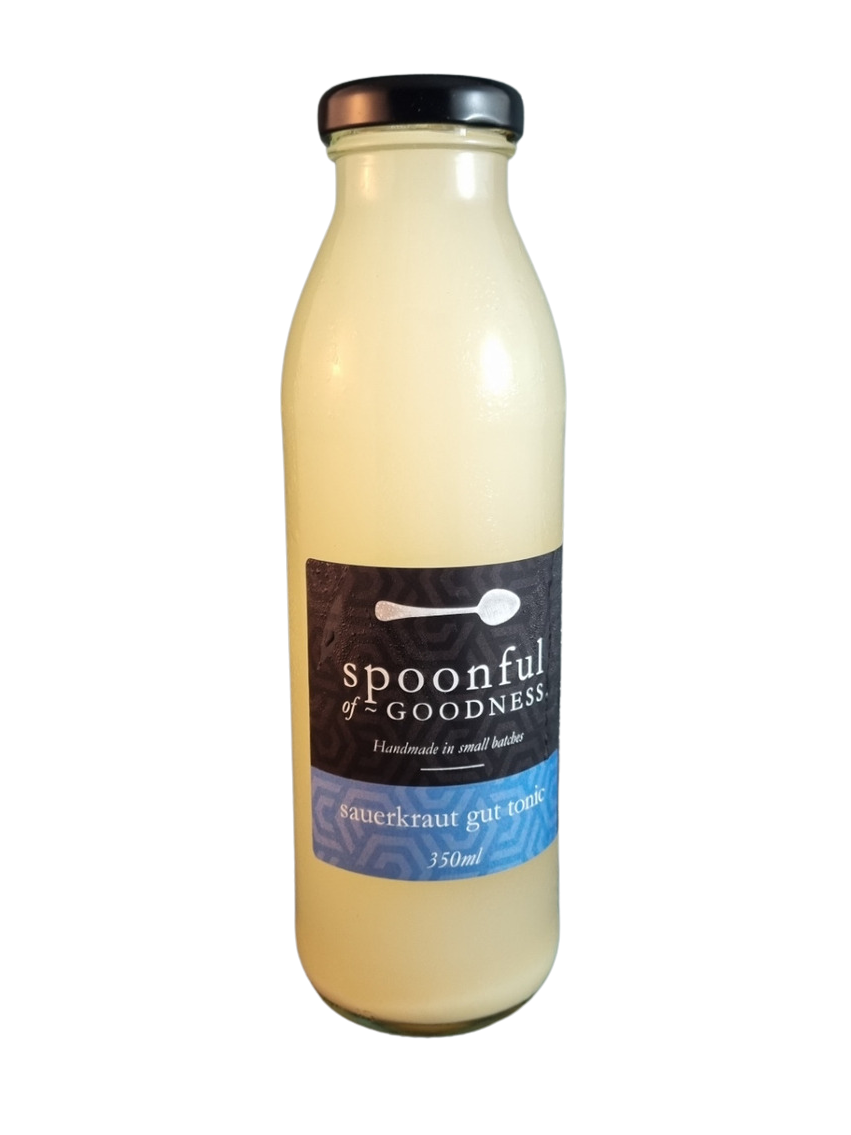 This is the juice from our fermented sauerkraut – it has all the goodness (probiotics, enzymes, vitamins and minerals) of our kraut but without the fibre. Great for a gut healing protocol, but also just as a daily health tonic